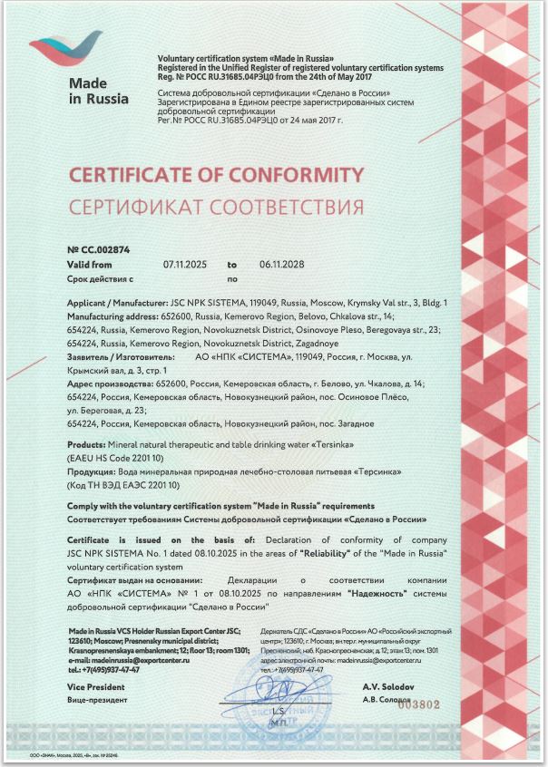Производитель минеральной воды «Терсинка» компания «СИСТЕМА» получила сертификат национального проекта «Сделано в России», что подтверждает соответствие продукции высоким стандартам качества и её российское происхождение.